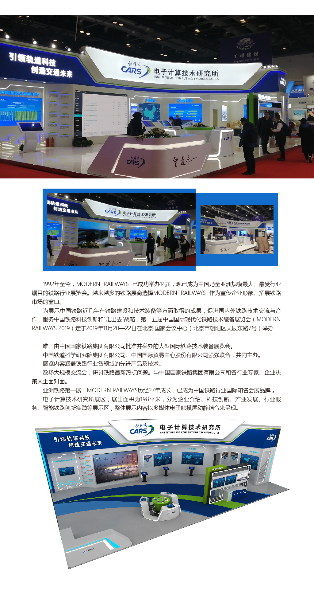 電子計算技術研究所展區,展出面積為198平米,分為企業介紹、科技創新、產業發展、行業服務、智能鐵路創新實踐等展示區,整體展示內容以多媒體電子觸摸屏動靜結合來呈現。