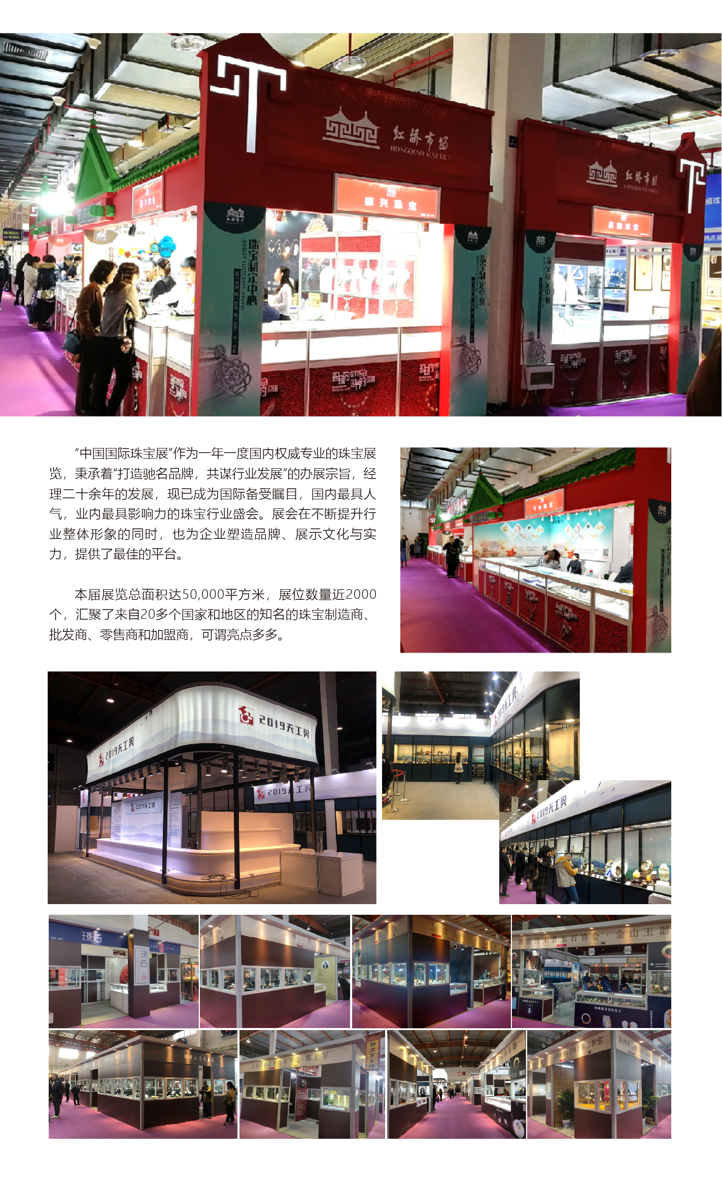 由中國珠寶首飾行業協會、國土資源部珠寶玉石首飾管理中心等單位組織,2019中國國際珠寶首飾展覽會將于2019年11月14-18日在北京中國國際展覽中心(老館)舉行。本屆珠寶展著力為珠寶生產、經銷商及協會、媒體等社會大眾搭建交流交易平臺,力邀美國、韓國、中國臺灣、香港、斯里蘭卡等國內外珠寶首飾優秀企業,展示最新珠寶首飾及行業趨勢新品發布,提升珠寶品牌傳播,展會同期將舉辦國際專家講座、靚模演繹奢華、現場拍賣會等眾多精彩紛呈的活動。盛典博覽公司負責紅橋市場展區的整體設計與搭建,得到了展商的認可和肯定。